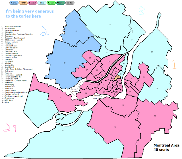 I hope that this can explain why my "gutomatic" projections in the Atlantic look so "weird". This is especially true when you consider that I am looking at current, not past candidates. The lack of a CPC star in Egmont reduces their vote there. A Green star candidate in Avalon increases the chance for a split vote. A Liberal star in Cumberland is balanced by the lack of a Liberal star in Kings-Hants.
